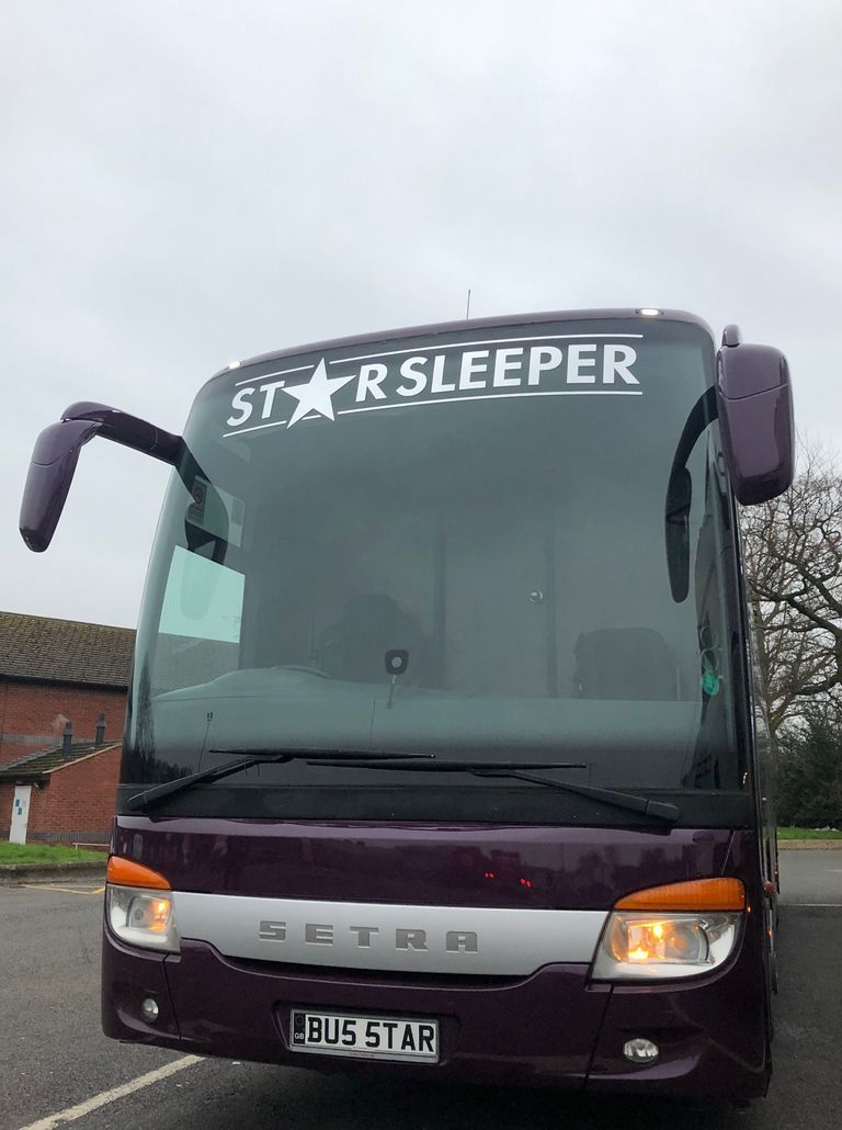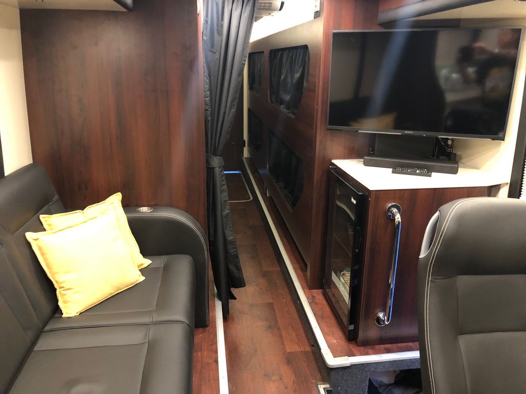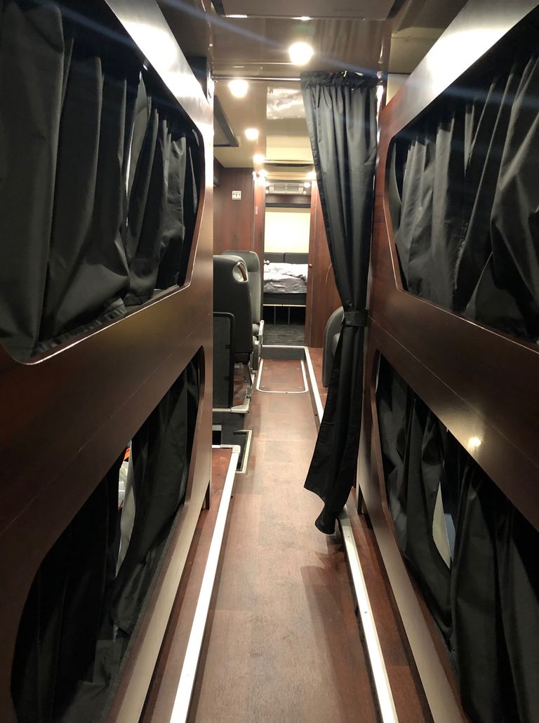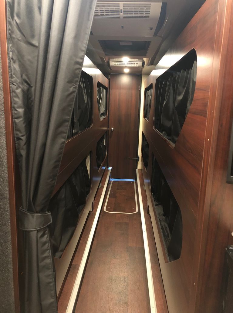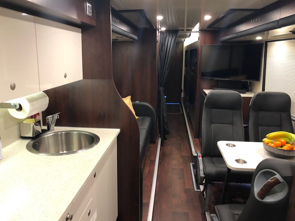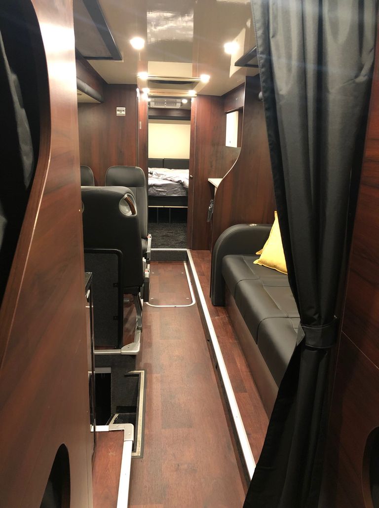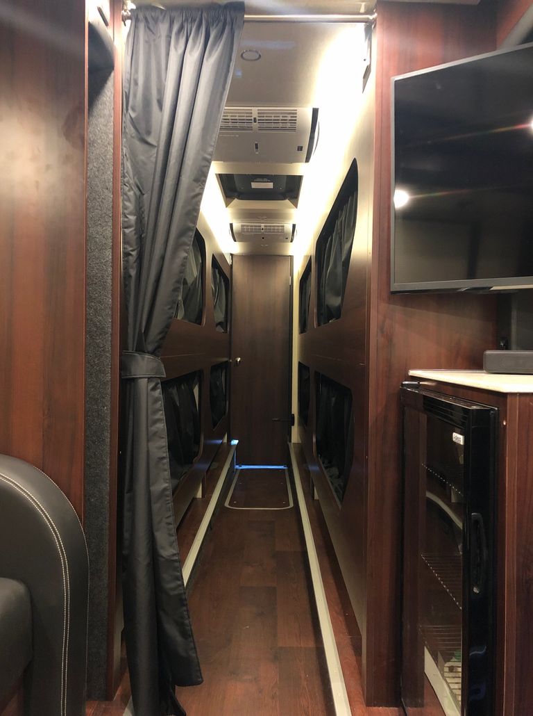 We have 2 of these specially built single deckers. Each has 8 very large bunks with memory foam matress, soft touch duvet and hotel quality pillows. Every bunk is 2 meters or 6.7 ft in length with huge headroom. Both have been designed to our own specification and are completely identical in design and layout. Each bunk has it’s own private locker and digital safe. Every bunk has it’s own 16″ flat screen TV with movie media player giving each passenger their own choice of movie selection. There is a lounge in the centre of the bus with seats around a table opposite a large sofa comfortable seating up to 7 people. In this lounge there is a Sony Bravia flat screen TV, bluetooth soundbar, movie hard drive & PS4. The kitchen has the usual tour bus facilities. In the rear lounge there is an additional large flat screen Sony Bravia TV, bluetooth soundbar, movie hard drive & PS4. This rear lounge has a an inter connecting en- suite bathroom and shower and can also be converted to a private Star Bedroom with double bed for an individual artist.There are 3 rooftop air conditioning pods that give separate temperature controlled areas of the bus. The rear lounge has it’s own roof top pod giving it separate climate control which is great if it’s converted to the Artists Bedroom.