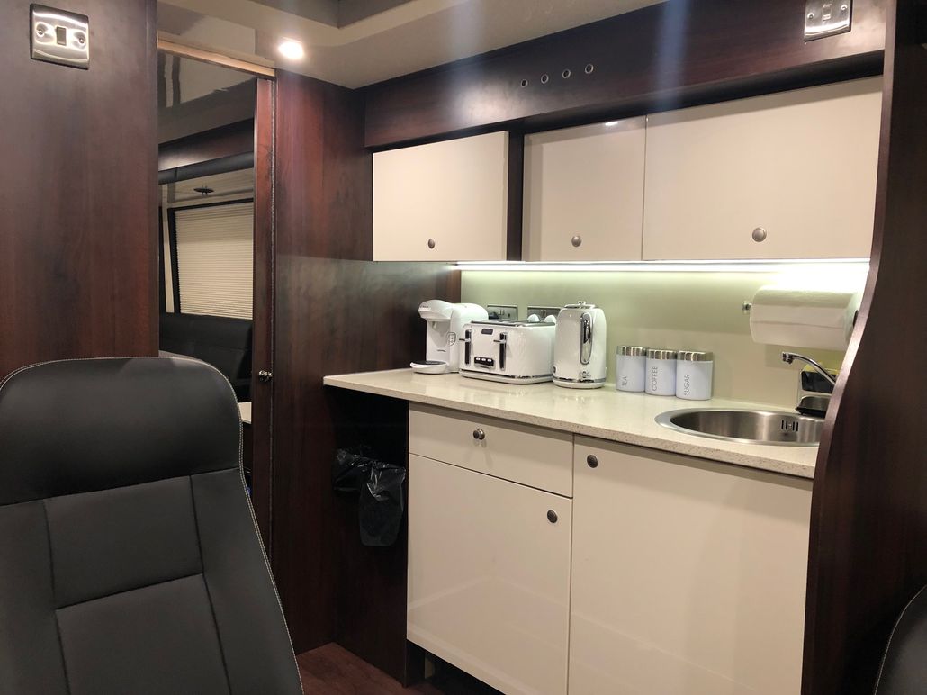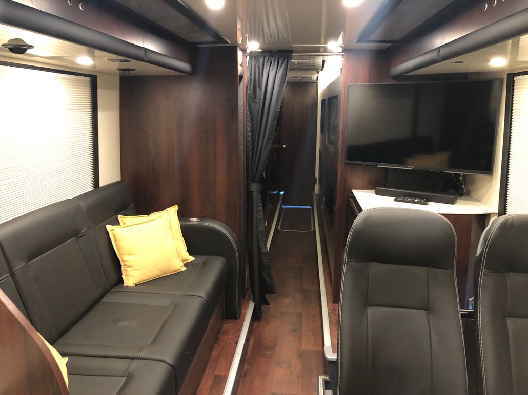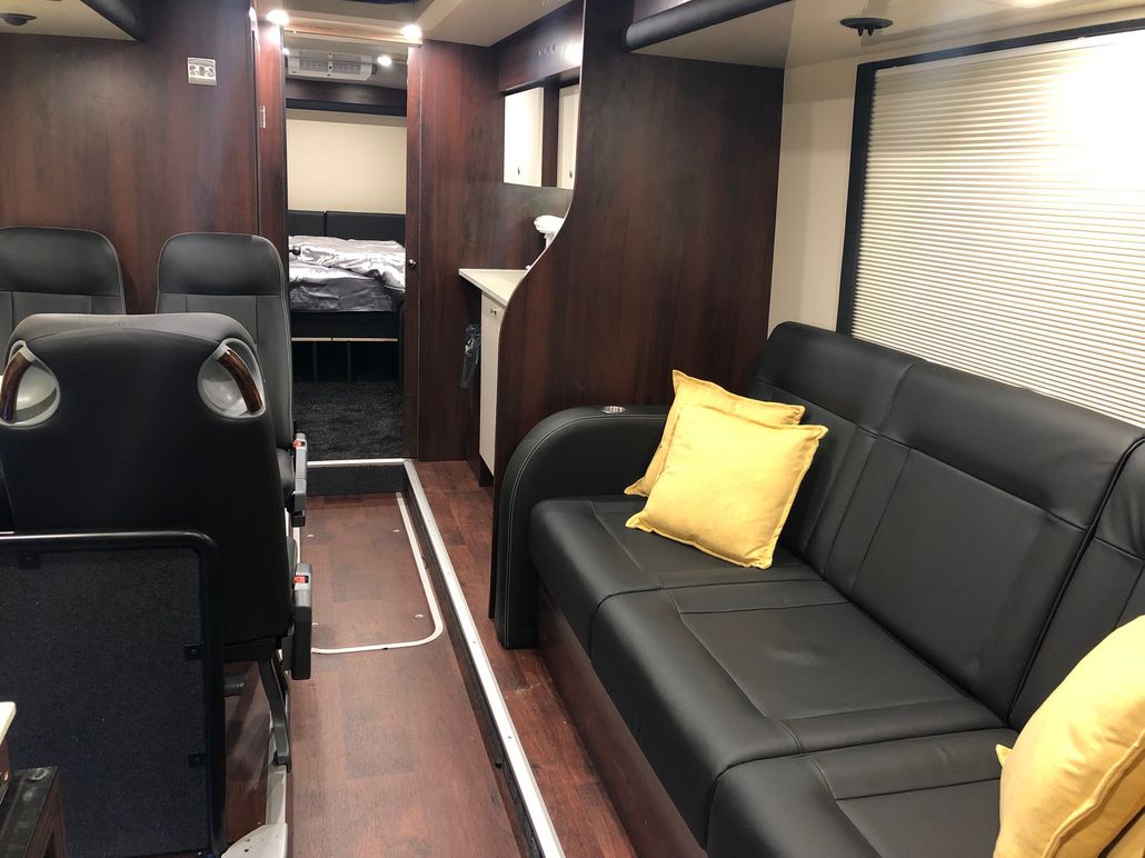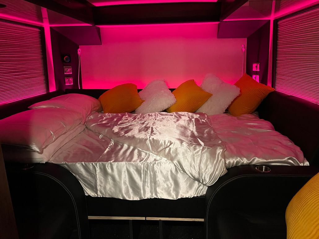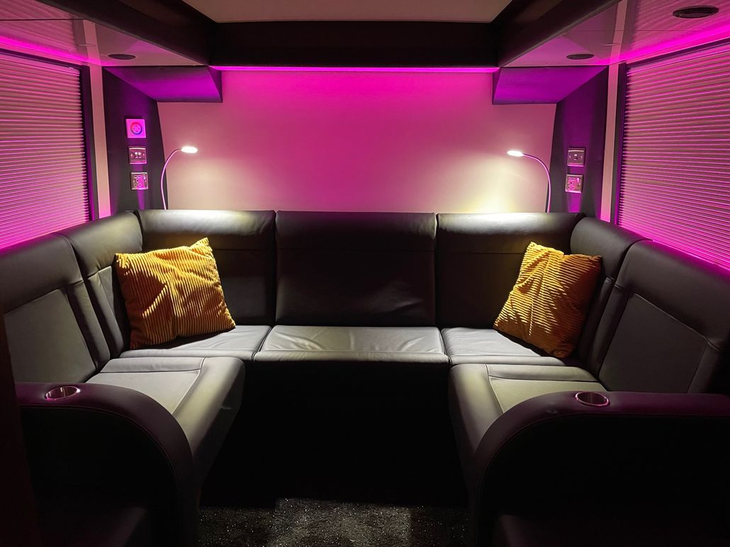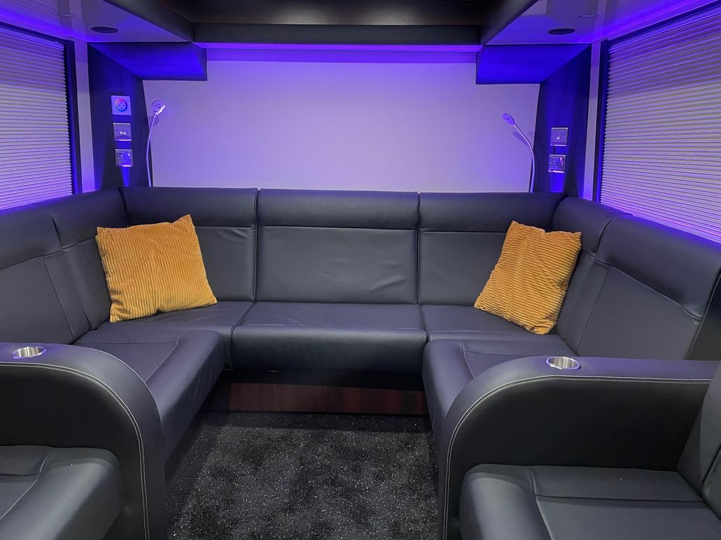 We have 2 of these specially built single deckers. Each has 8 very large bunks with memory foam matress, soft touch duvet and hotel quality pillows. Every bunk is 2 meters or 6.7 ft in length with huge headroom. Both have been designed to our own specification and are completely identical in design and layout. Each bunk has it’s own private locker and digital safe. Every bunk has it’s own 16″ flat screen TV with movie media player giving each passenger their own choice of movie selection. There is a lounge in the centre of the bus with seats around a table opposite a large sofa comfortable seating up to 7 people. In this lounge there is a Sony Bravia flat screen TV, bluetooth soundbar, movie hard drive & PS4. The kitchen has the usual tour bus facilities. In the rear lounge there is an additional large flat screen Sony Bravia TV, bluetooth soundbar, movie hard drive & PS4. This rear lounge has a an inter connecting en- suite bathroom and shower and can also be converted to a private Star Bedroom with double bed for an individual artist.There are 3 rooftop air conditioning pods that give separate temperature controlled areas of the bus. The rear lounge has it’s own roof top pod giving it separate climate control which is great if it’s converted to the Artists Bedroom.