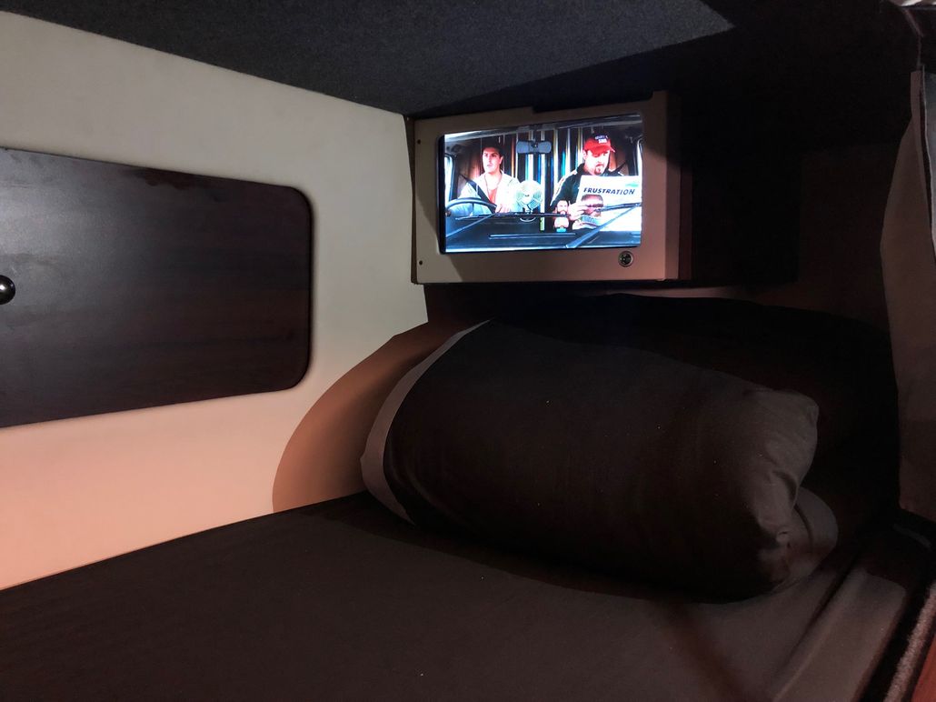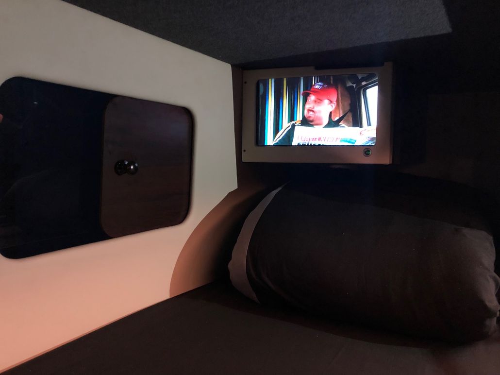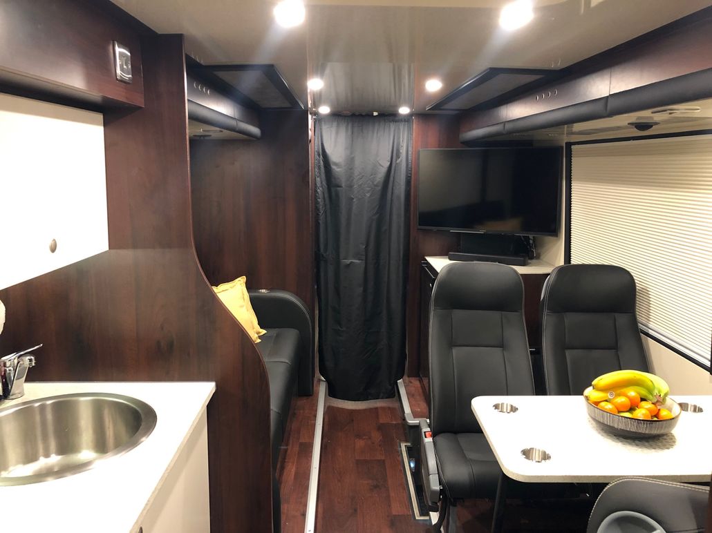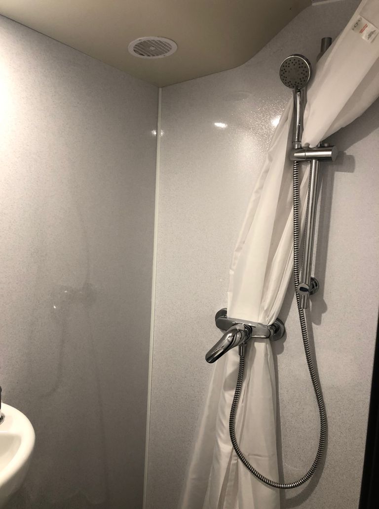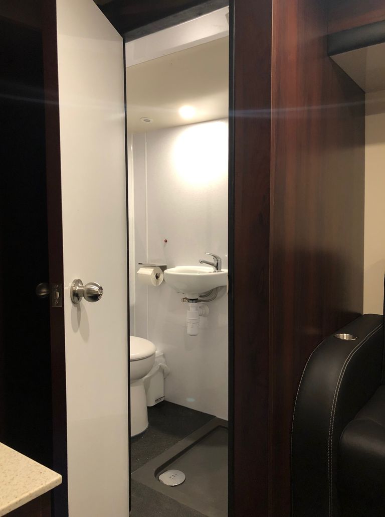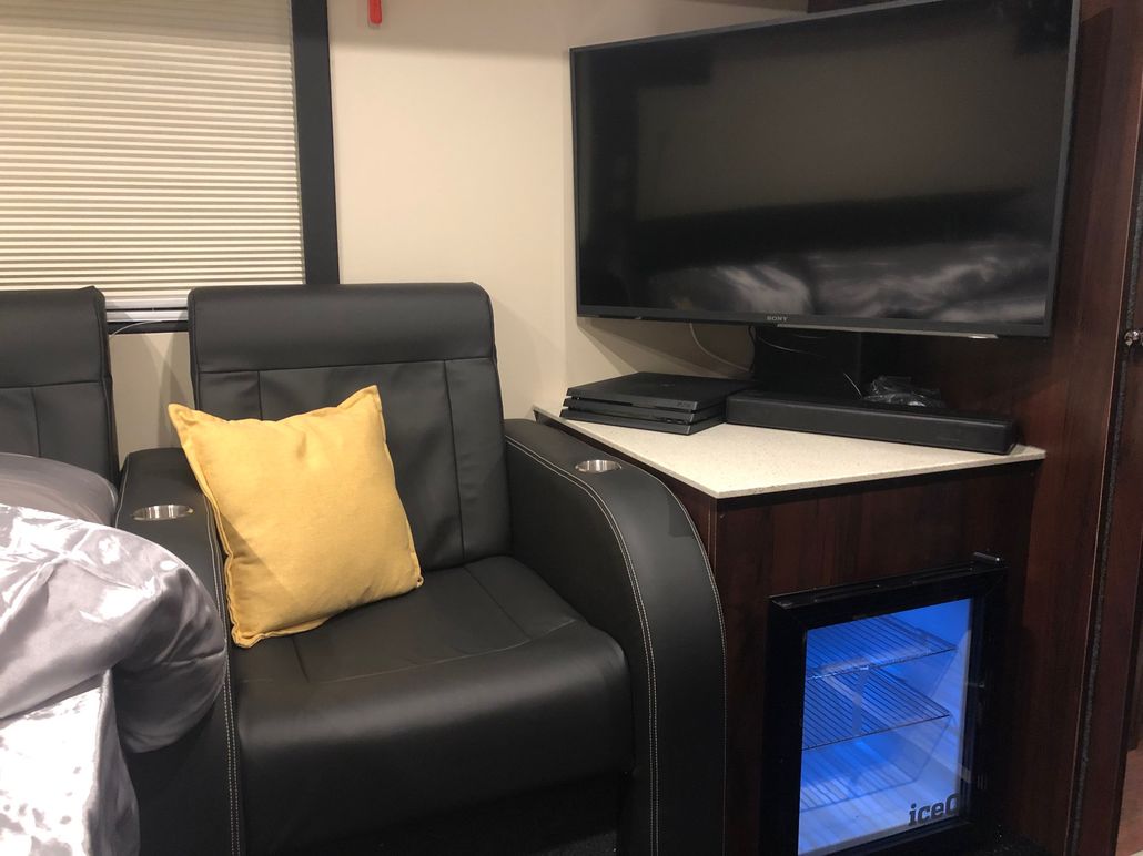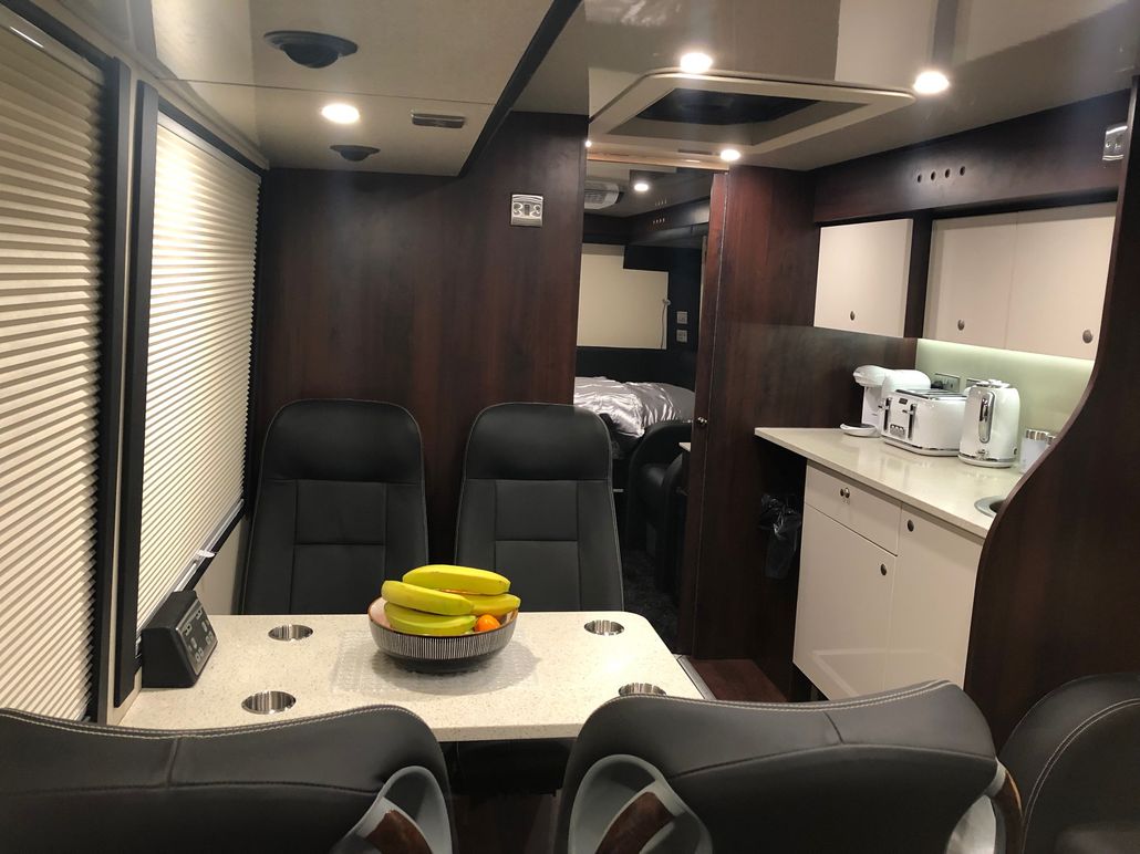 We have 2 of these specially built single deckers. Each has 8 very large bunks with memory foam matress, soft touch duvet and hotel quality pillows. Every bunk is 2 meters or 6.7 ft in length with huge headroom. Both have been designed to our own specification and are completely identical in design and layout. Each bunk has it’s own private locker and digital safe. Every bunk has it’s own 16″ flat screen TV with movie media player giving each passenger their own choice of movie selection. There is a lounge in the centre of the bus with seats around a table opposite a large sofa comfortable seating up to 7 people. In this lounge there is a Sony Bravia flat screen TV, bluetooth soundbar, movie hard drive & PS4. The kitchen has the usual tour bus facilities. In the rear lounge there is an additional large flat screen Sony Bravia TV, bluetooth soundbar, movie hard drive & PS4. This rear lounge has a an inter connecting en- suite bathroom and shower and can also be converted to a private Star Bedroom with double bed for an individual artist.There are 3 rooftop air conditioning pods that give separate temperature controlled areas of the bus. The rear lounge has it’s own roof top pod giving it separate climate control which is great if it’s converted to the Artists Bedroom.